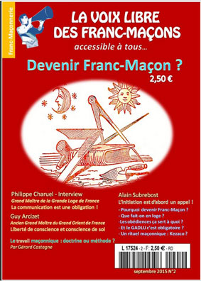 Devenir Franc-Maçon ? Quel rituel, quelle obédience ? Et le Gadlu dans tout ça ? Interview exclusive de Philippe Charuel Grand Maître de la Grande Loge de France : La Communication est une obligation ! Alain Subrebost : installer en soi le silence intérieur, Guy Arcizet : Liberté de conscience ou conscience de soi ? La méthode maçonnique : doctrine ou méthode ? par Gérard Castagne – Lydia Aractingi : première femme designer de meubles maçonniques… Dans la Voix Libre des Franc-Maçons septembre 2015.